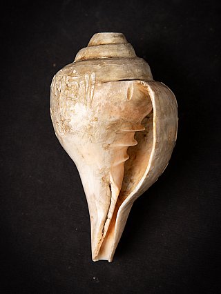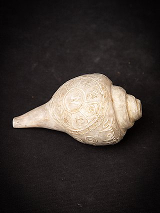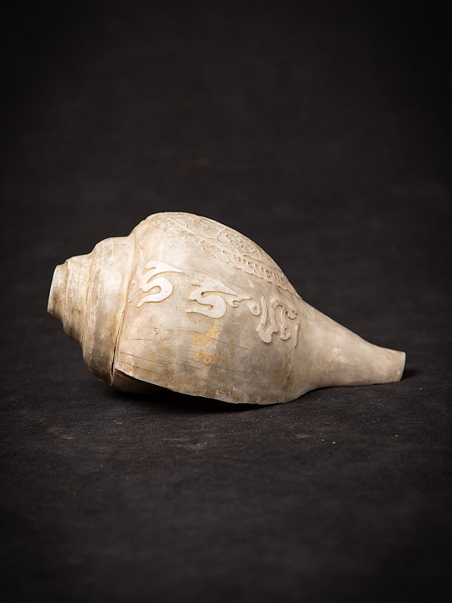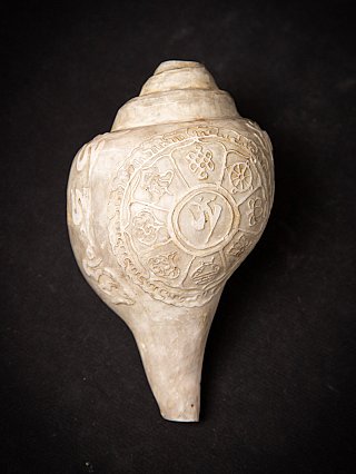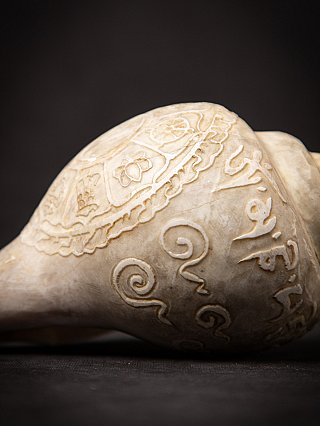This exquisite 19th-century Tibetan Shankha shell, measuring 9 cm in height and weighing 692 grams, showcases the rich spiritual heritage of Tibetan culture. Traditionally, shells like this were used as conch trumpets in Buddhist rituals, symbolizing the profound sound of the Dharma, which awakens beings from ignorance. The artistry etched onto the surface reflects intricate symbols and mantras, serving both decorative and ceremonial purposes.