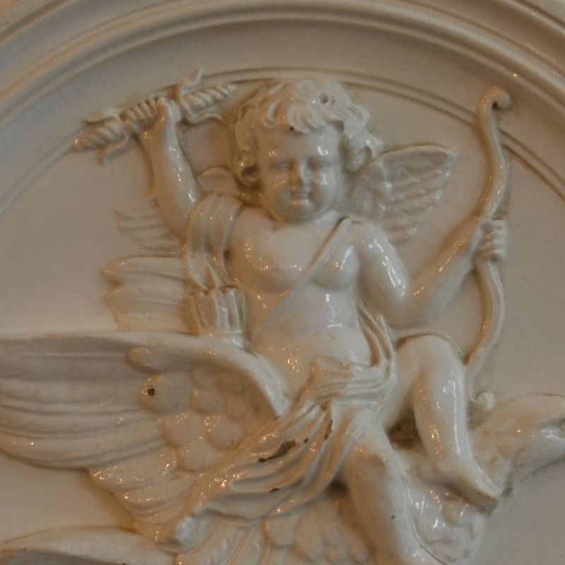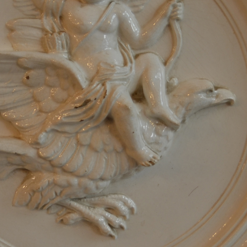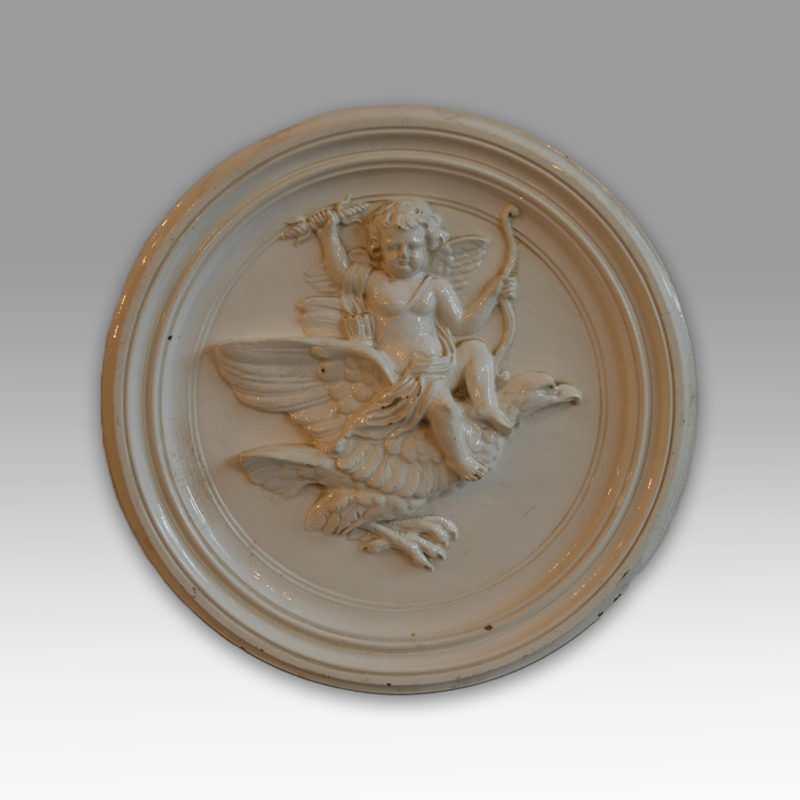Italian ceramic wall decorative rosette with a relief representation of the god Eros, with his bow and arrow, riding an eagle.