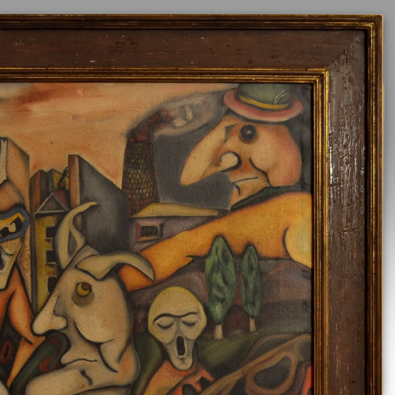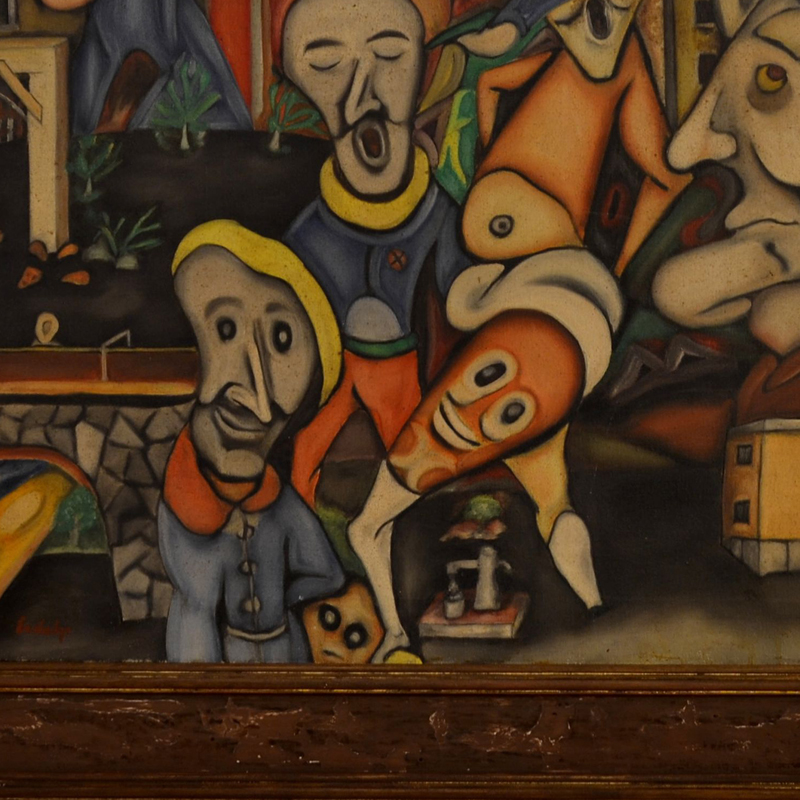 The human figures, with distorted faces and exaggerated features – often with masks or closed eyes – refer to alienation, loss of identity or even oppression; something reinforced by the presence of the gallows in the background on the left, which may indicate violence or political asphyxiation.