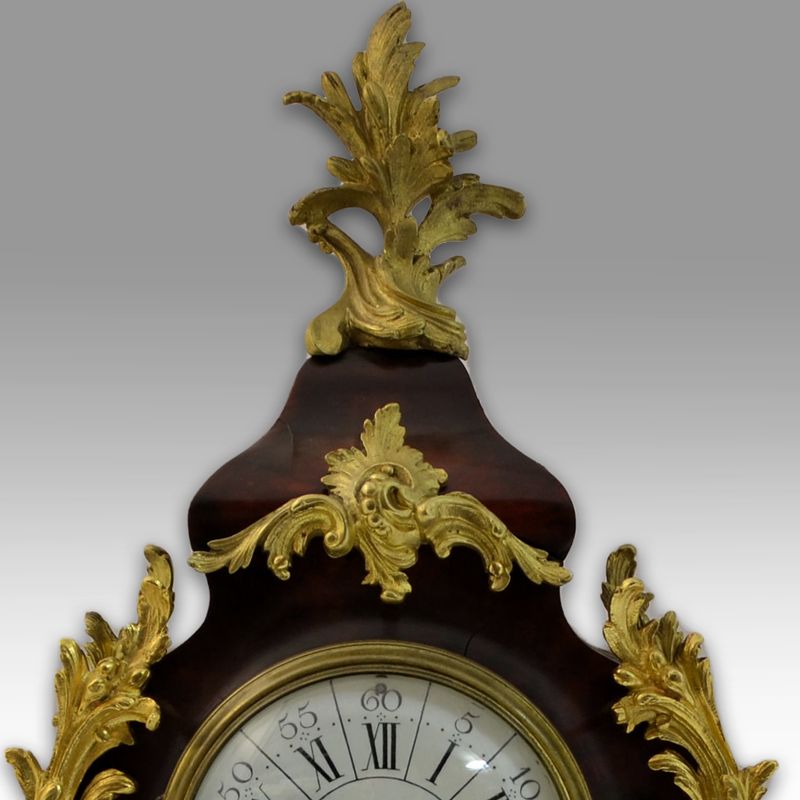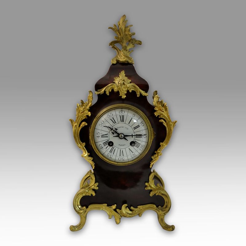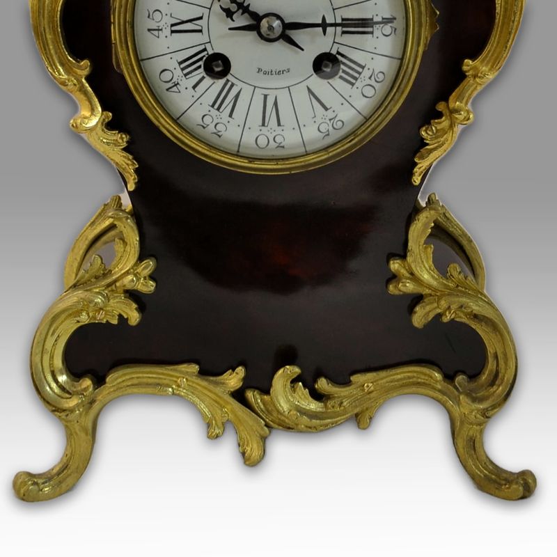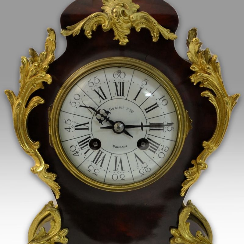 French wooden clock from the Napoleon III era, inlaid with tortoiseshell. It has carved bronze gilded decorative elements with floral motifs and a porcelain dial.