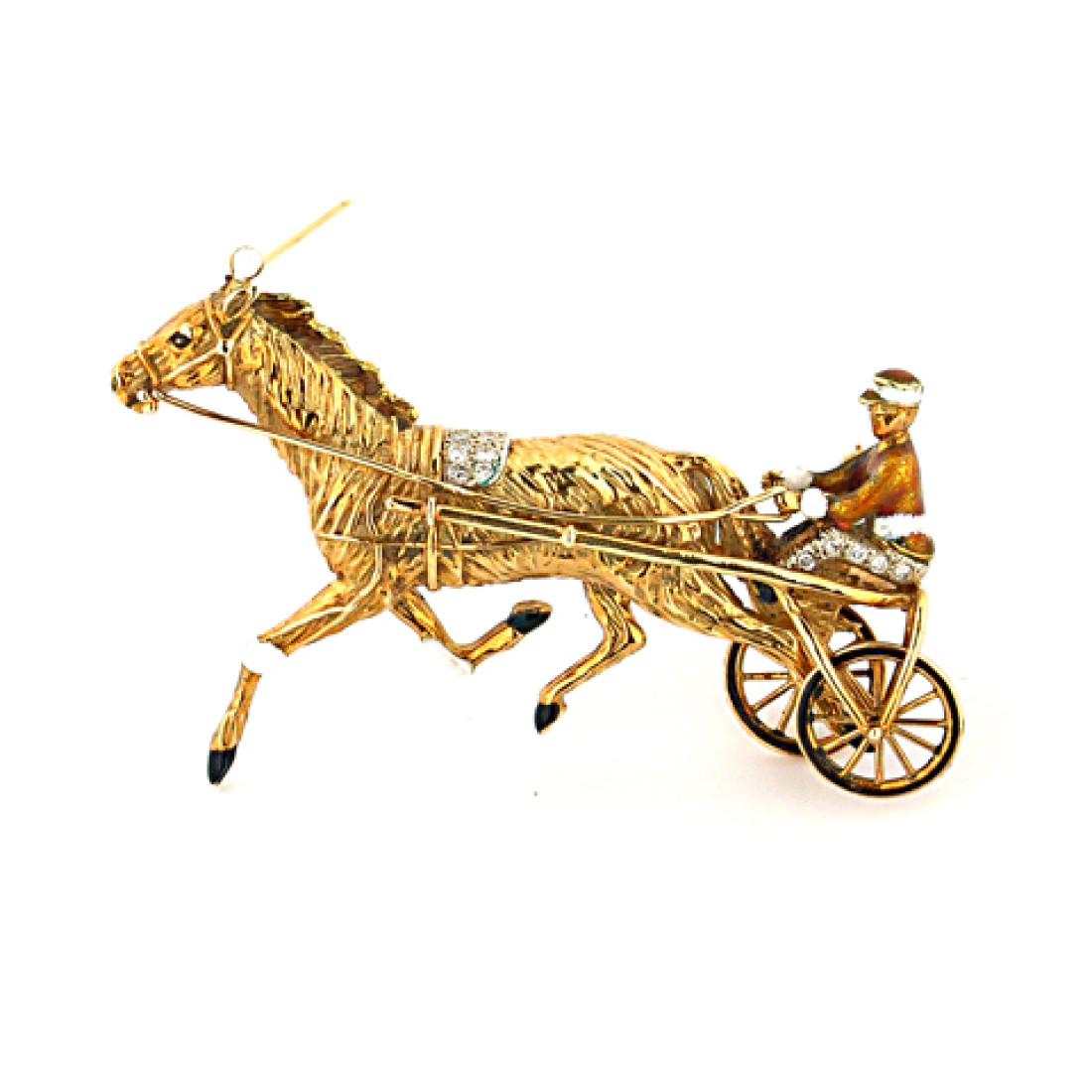 Neiman Marcus 18K gold brooch depicting a racing carriage with a horse and Jockey. It is decorated with enamel and 11 brilliant-cut diamonds 0.35ct G-VVS1. Comes with an authentic Neiman Marcus leather case