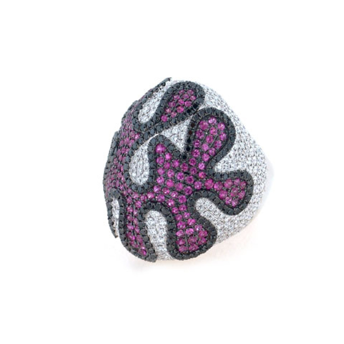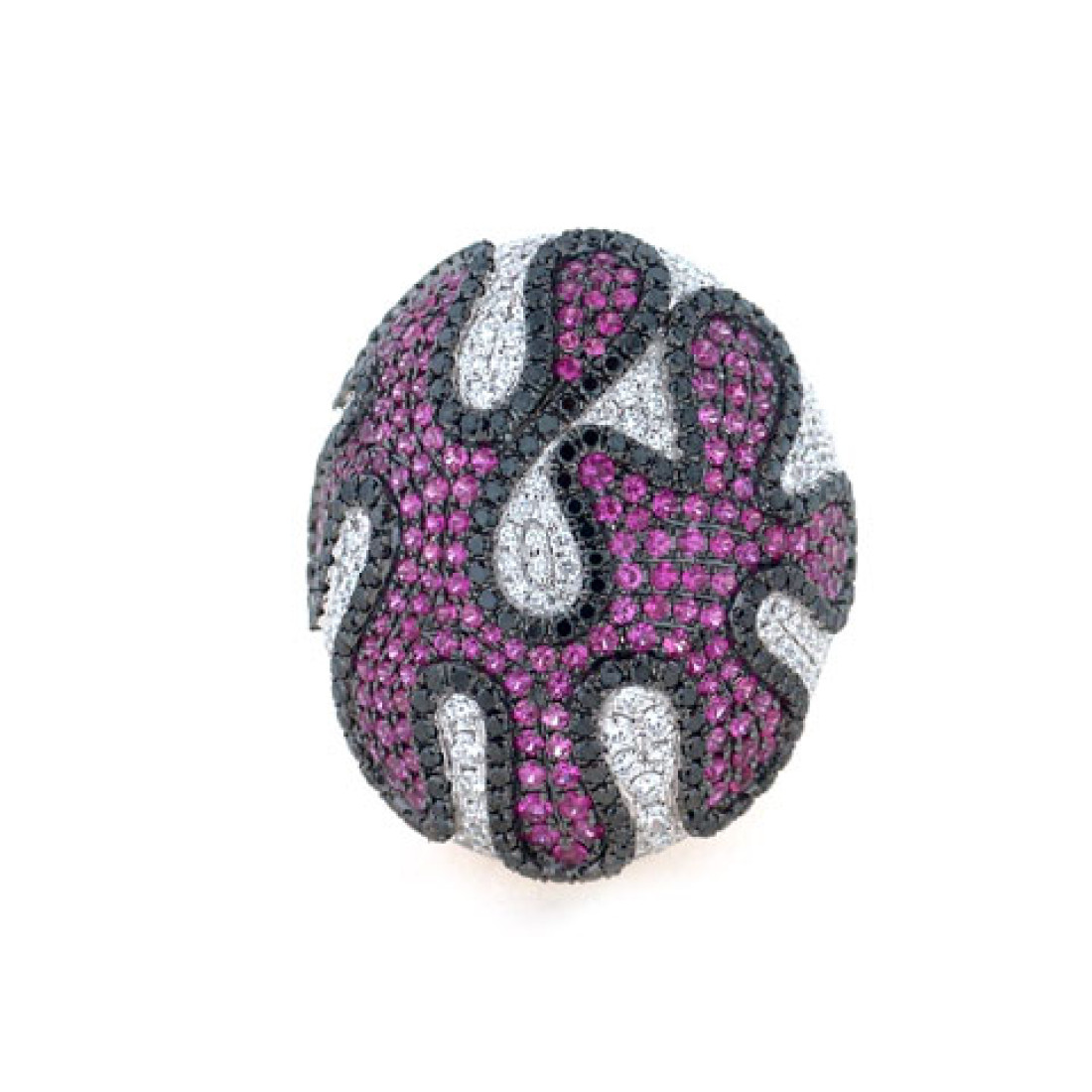 18K white gold ring with 4.16ct F-VS1 Diamonds, 2.31ct Black Diamonds and 3.20ct Pink Sapphires