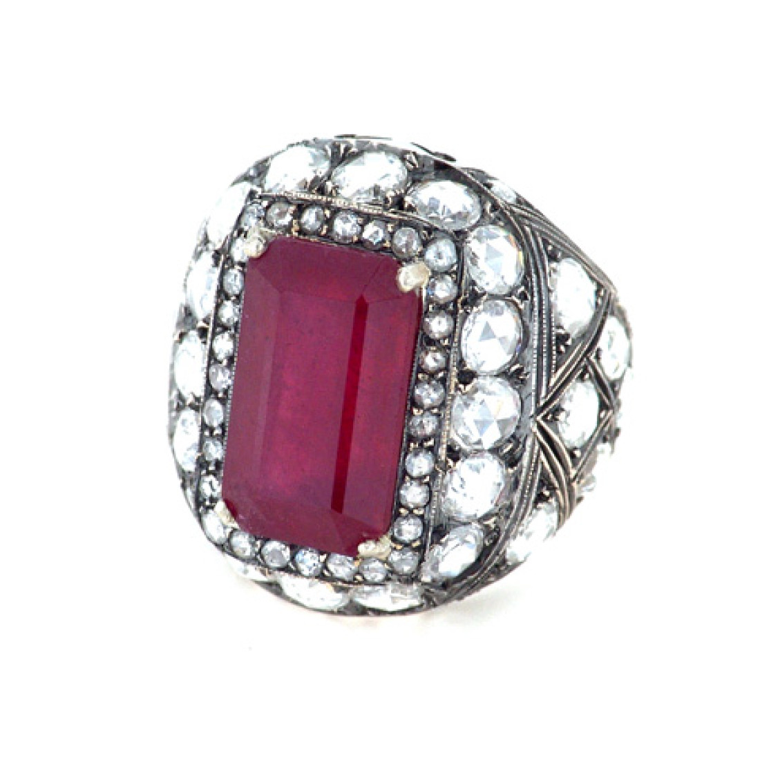 14K White Gold Ring with a 11.36ct staggered trapezoid cut Ruby and 6.85ct Crown Diamonds.