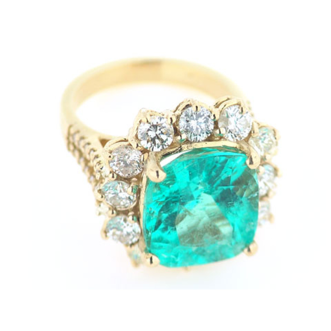 18K Gold Ring with a 9.64ct Cushion Cut Colombian Emerald and 3.12ct Brilliant Diamond IJ VS1-SI1.