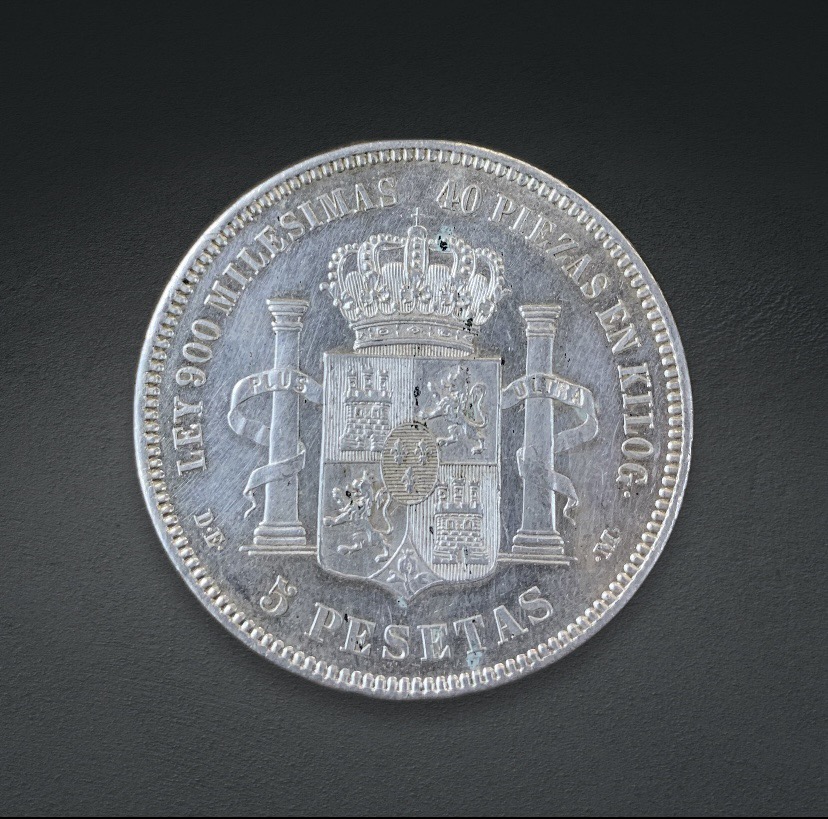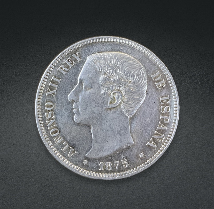 Spain 5 Pesetas – Alfonso XII 1st portrait 1875 , condition XF plus – AU.